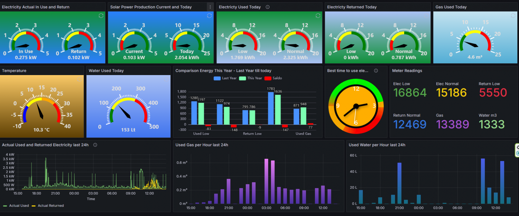 Hier zie je als voorbeeld mijn schermen. Je kunt deze schermen als uitgangspunt gebruiken. Omdat in mijn opzet de data (MySQL) is losgekoppeld van de presentatie (Grafana) is het makkelijk om je eigen invulling hieraan te geven. Heb jij bijv. geen temperatuurmeter, watermeter of zonnepanelen, dan kun je binnen grafana de desbetreffende panels gewoon verwijderen.